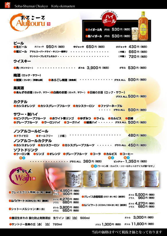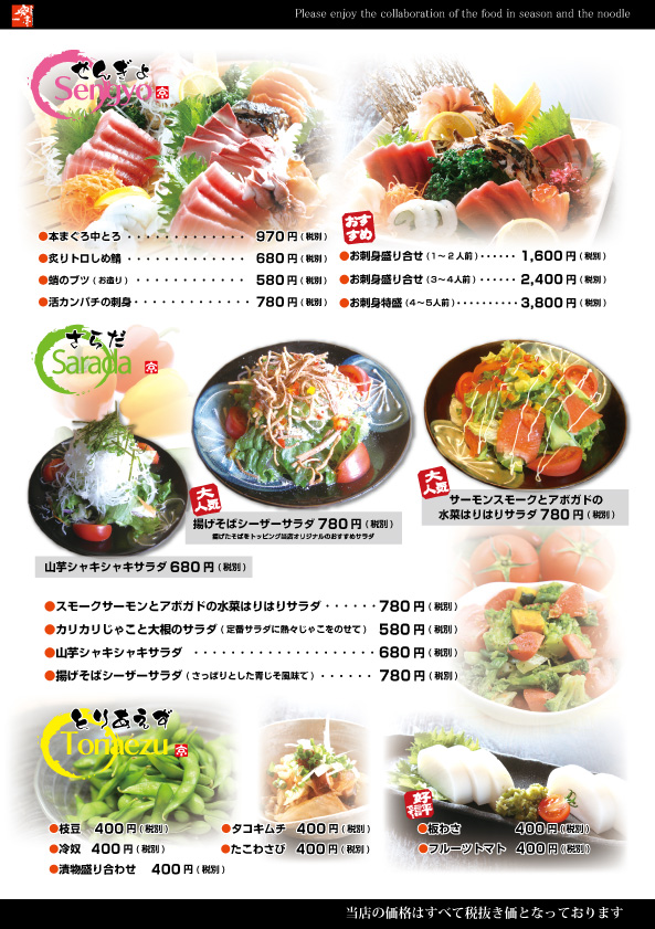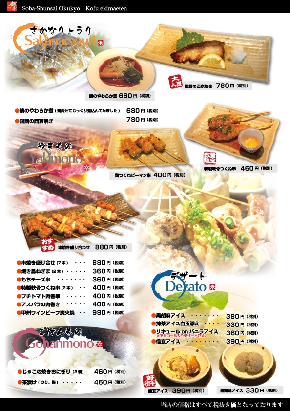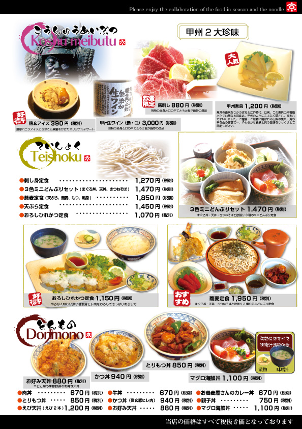長野県安曇野産最高級のそば粉を使った自慢のそばを中心に、オリジナル創作料理などお食事から、お酒がすすむメニューまで豊富に取り揃えております。また、その時期でおすすめのメニューもありますので要チェック!