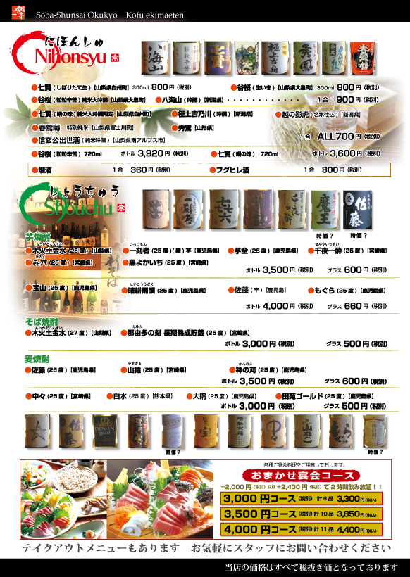 定番のお酒から、他ではなかなか手に入らないお酒、旬のお酒など取り揃えておりますので、詳しくはスタッフまでお気軽にお尋ねください。
